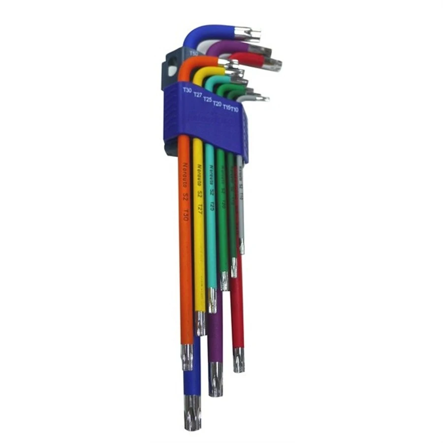 Das Kit besteht aus 9 Schlüsseln: T10, T15, T20, T25, T27, T30, T40, T45 und T50 sowie einem Lagerregal.