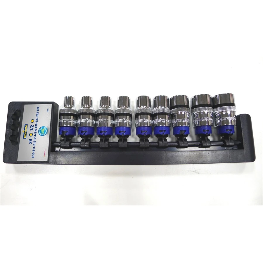 Diese Innensechsrund-Steckschlüssel von Norauto werden mit einer ½“ Zoll Vierkantratsche verwendet. Die Sockel dieser Schlüssel bestehen aus einer korrosions- und verschleißunempfänglichen Chrom-Vanadium Mischung. Zudem verfügt jeder Steckschlüssel über rutschfeste Kerben, wodurch ein Abrutschen verhindert wird. Die Schlüssel haben eine Länge von 40 mm.